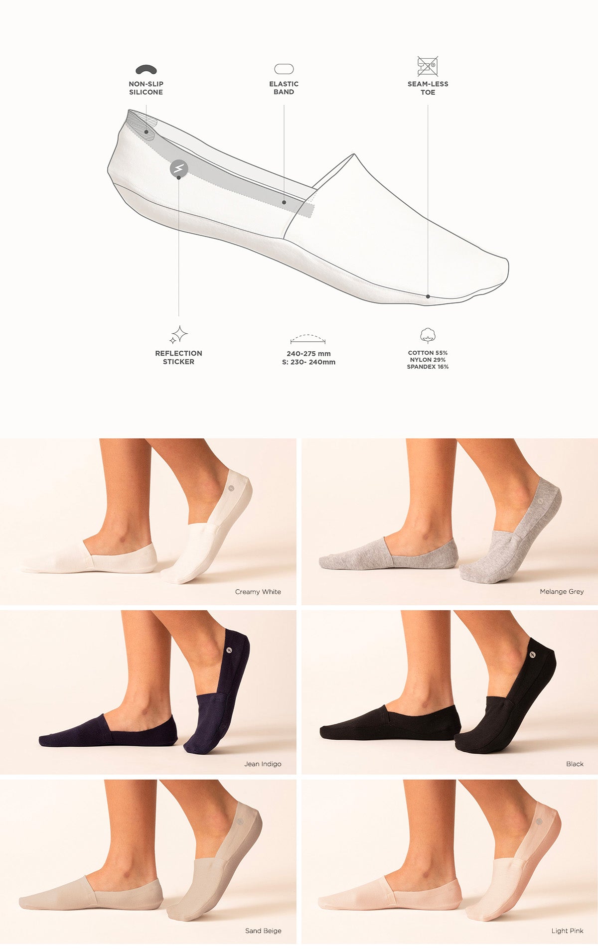 Don't sacrifice function for style. With the incredibly flexible bands around the rim of the sock and the thin silicone band on the edge of the sock, the socks stick to your feet with no slipping.